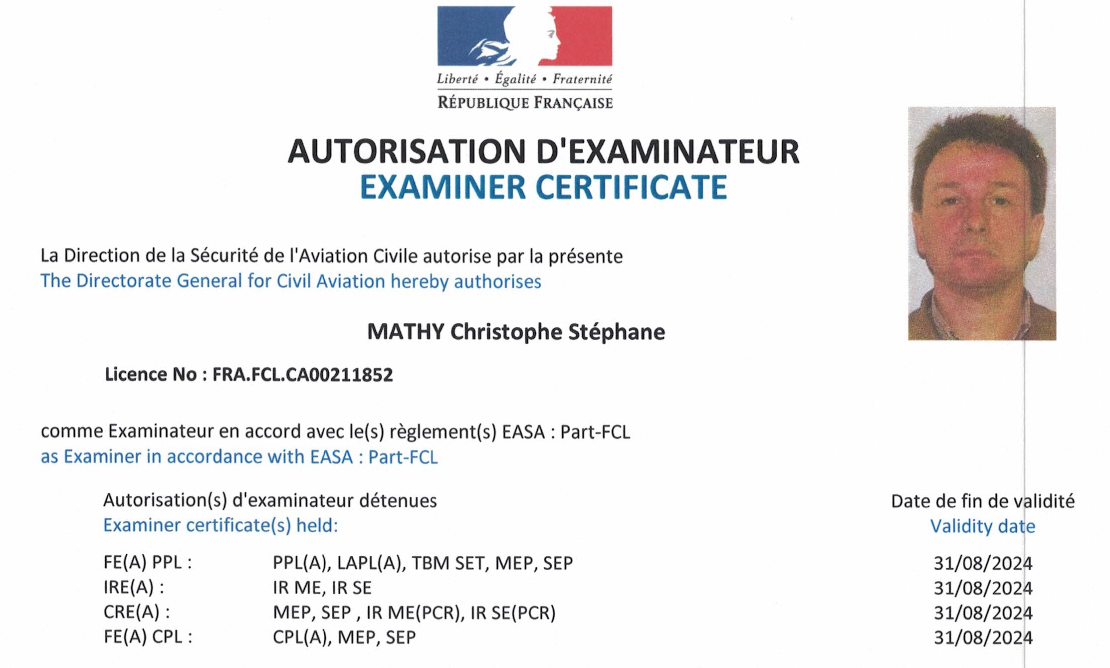 Examinateur FE (CPL, PPL & TBM SET), IRE, CRE (SEP & MEP)